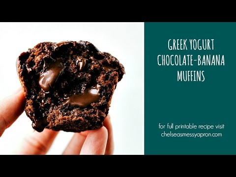 Greek Yogurt Chocolate Banana Muffins - Banana Muffins With Yogurt And Chocolate Chips - To view the full printable recipe, click here: http://www.chelseasmessyapron.com/greek-yogurt-chocolate-banana-muffins-movie/