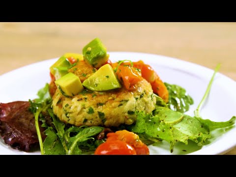 Fish Cakes with Avocado and Roasted Tomato Relish - Low Carb Fish Cakes - Get this recipe and other heart-healthy recipes at recipe.heart.org.